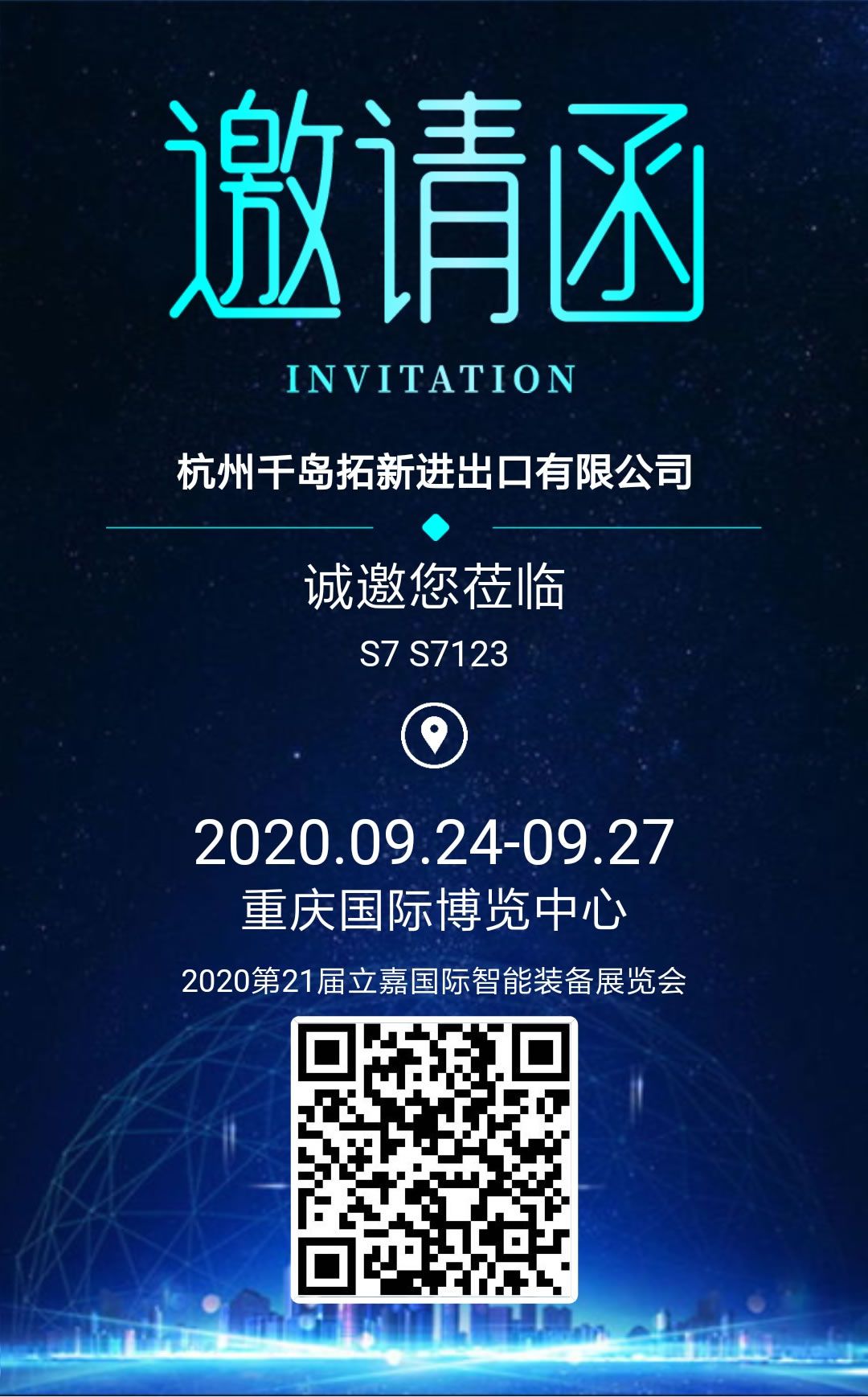 第21屆立嘉國際智能裝備展覽會將于2020年9月24—27日在重慶國際博覽中心舉辦,屆時,杭州千島拓新進出口有限公司將在重慶國際博覽中心7號館7123號展位恭迎您的蒞臨指導。